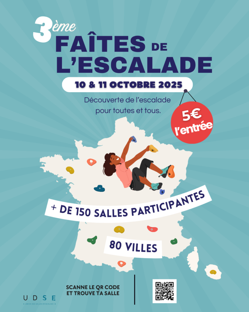 Faites de l’Escalade – Les 10 & 11 octobre 📆 Envie de découvrir l’escalade à petit prix ? C’est le moment parfait ! Pendant deux jours, l’entrée est à 5€ seulement pour tous ! Que vous soyez débutant ou expert, venez grimper à prix réduit, on vous attend nombreux et nombreuses 👀